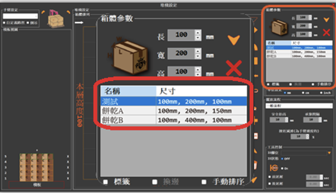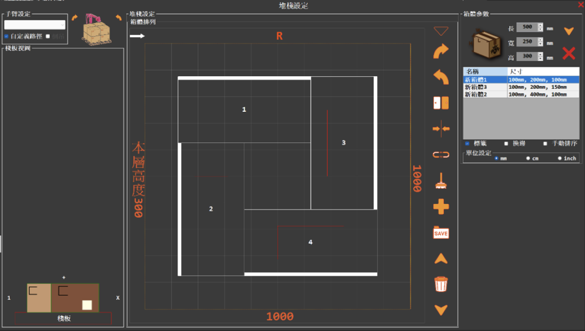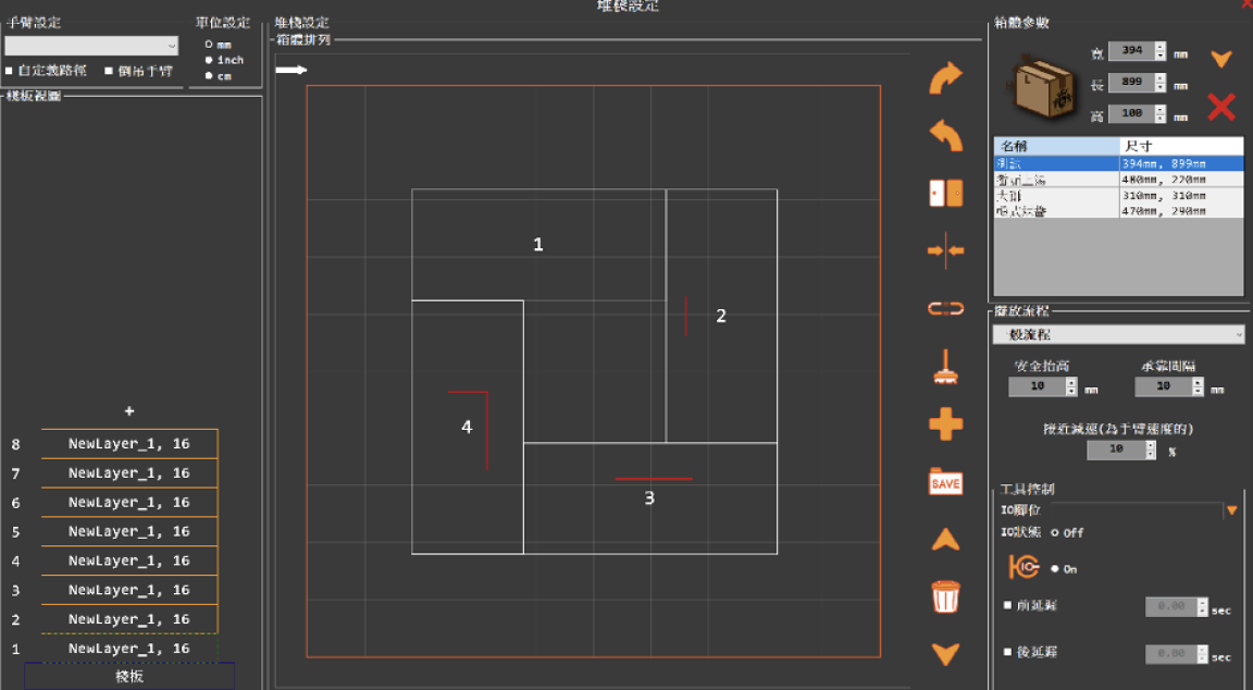 1. 快速設定介面使用 : 有別於傳統機械手臂需要學習教導器!現場人員只需要半小時即可自行排列廠內各種堆棧花色排法;擺脫傳統堆棧一個個排列,RAE 只須設定棧板、箱體大小,透過滑鼠進行箱體排列擺放,圖形自動計算,快速又整齊,每棧排列只需90~120秒!