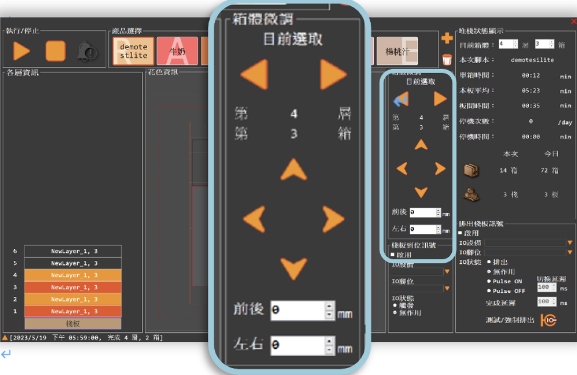5. 袋體、箱體位置調整 : 提供圖形化調整介面,使用者可依現場狀況輸入數值調整袋裝堆棧位置,亦或是點選方向箭頭調整,簡單且快速完成現場堆包位置調整