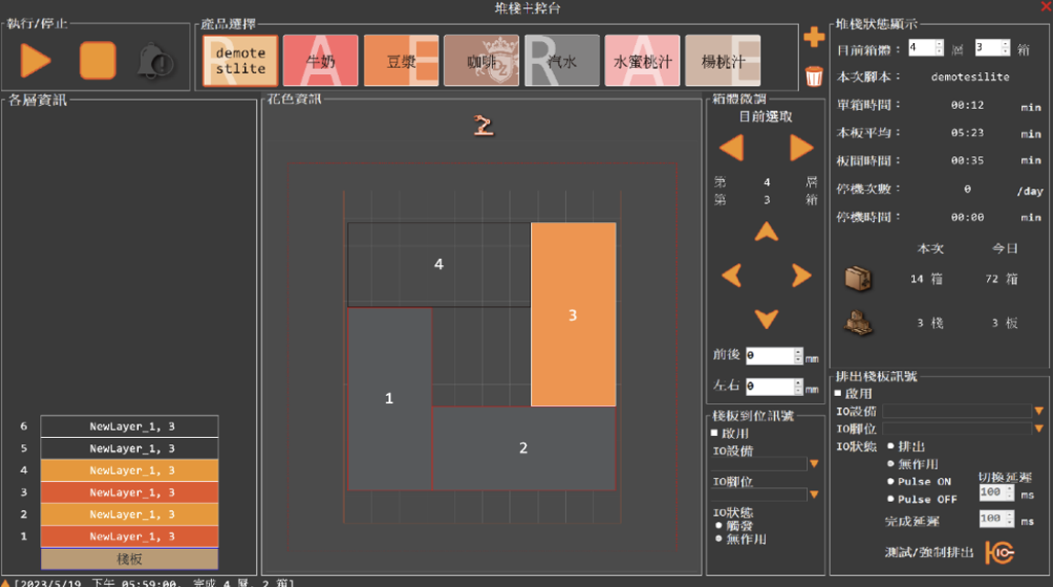 2. 堆棧狀態即時顯示 : 堆棧狀態以水位圖(堆棧層數水位圖、堆棧箱體狀態)顯示,可知道目前層數與箱數,正在堆、已堆棧位、未堆棧位一覽無遺